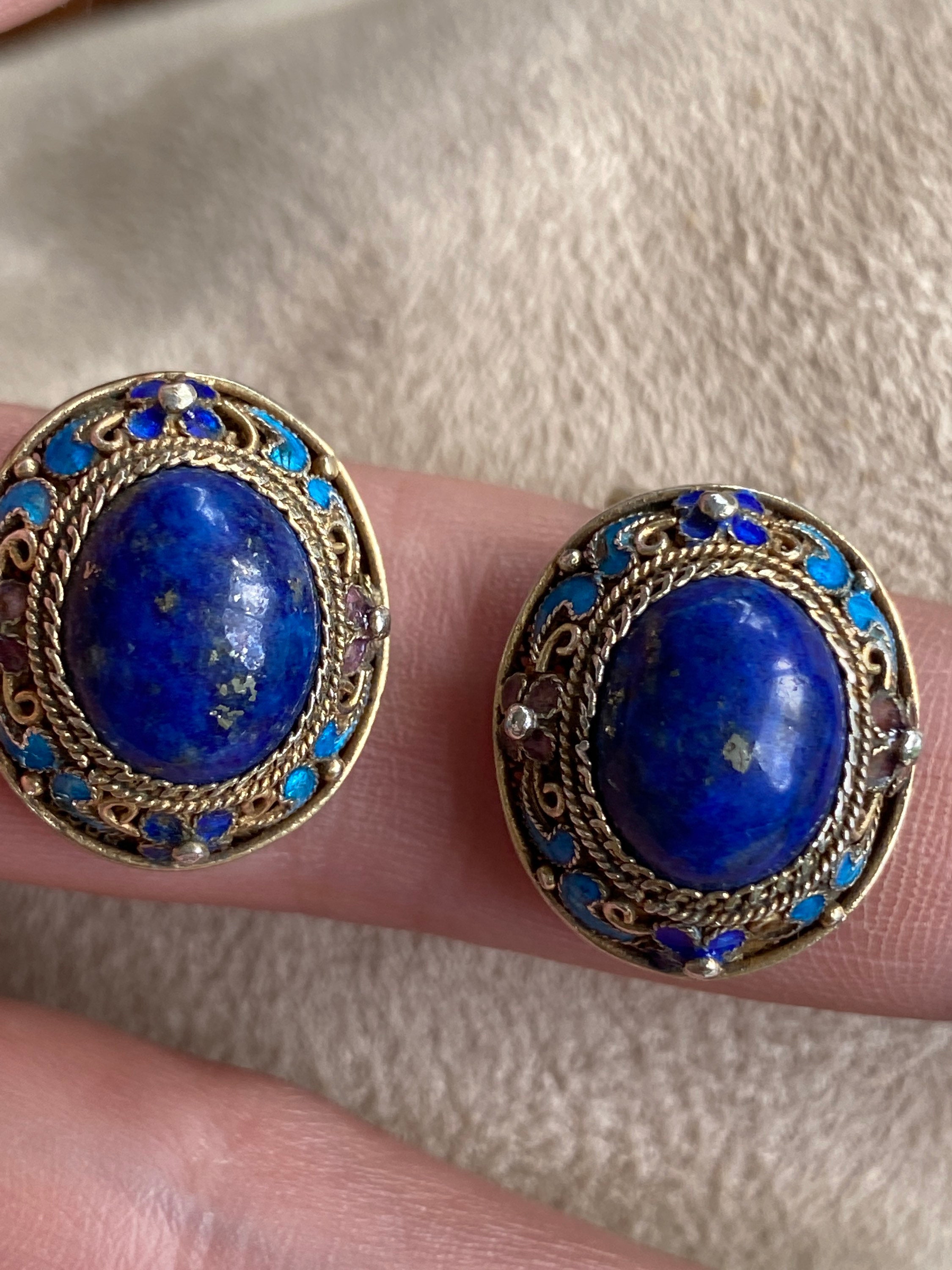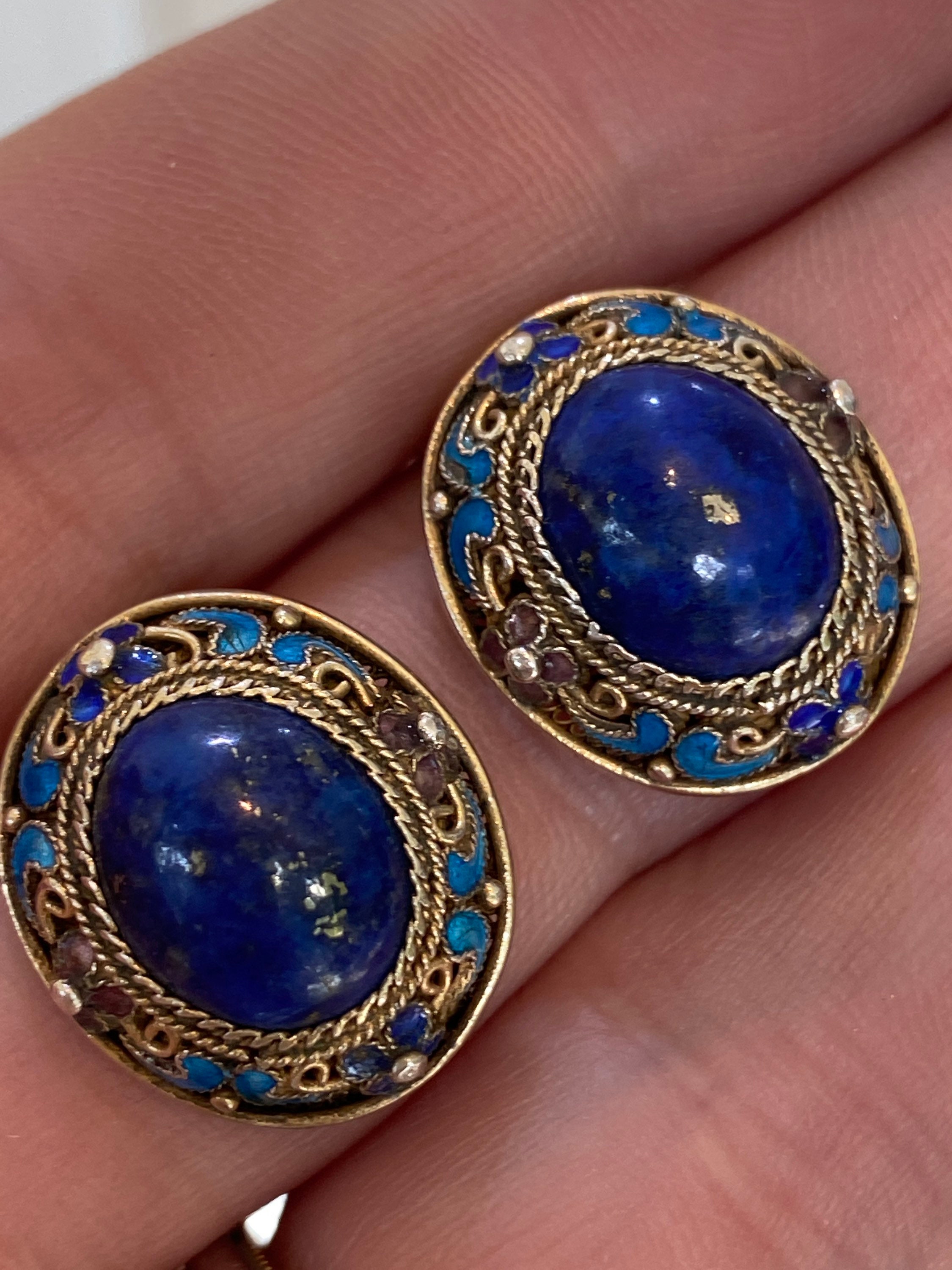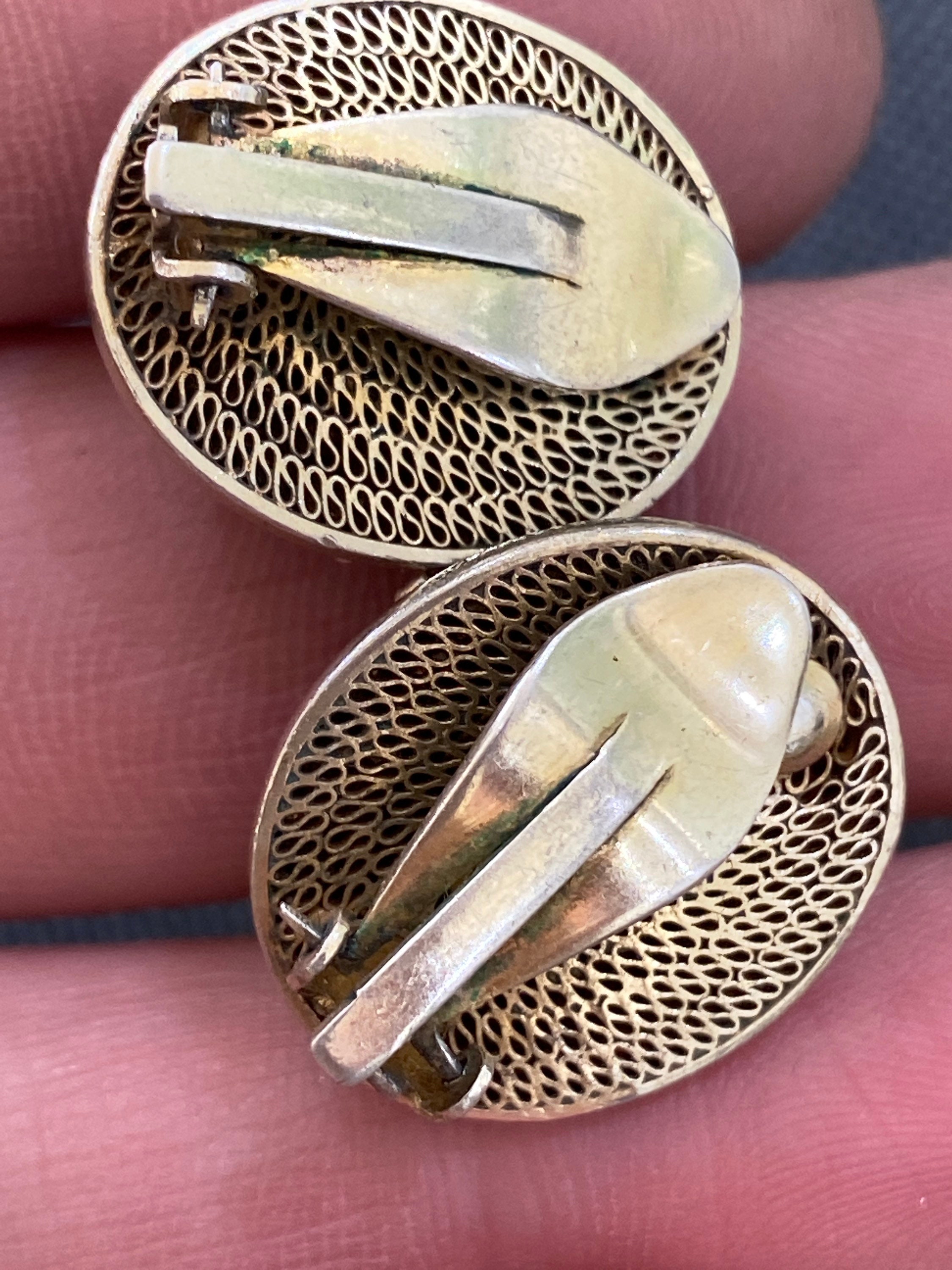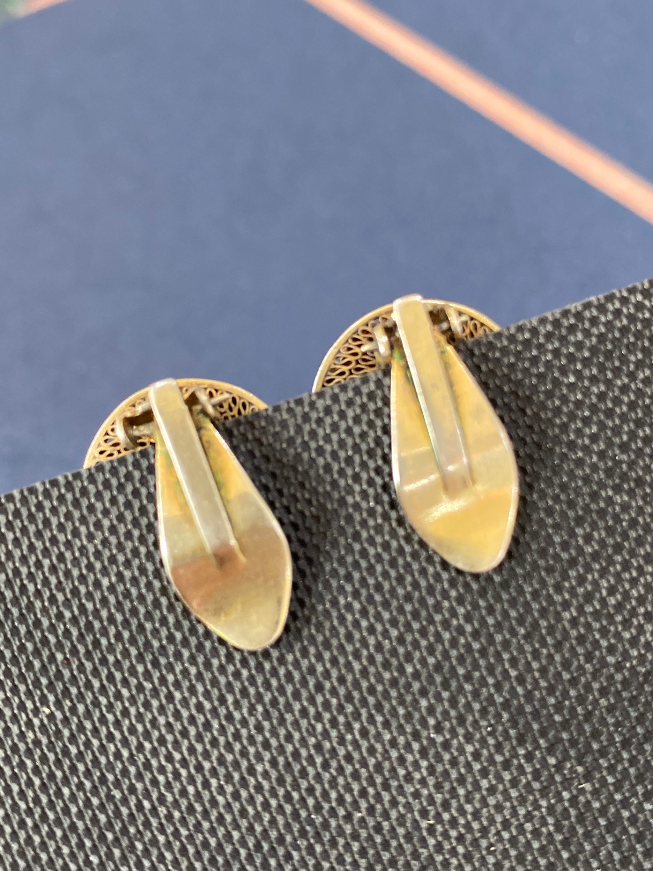 Here is a beautiful gilt silver filigree and enamel earrings .These were probably made for export around the 193-40s. they measure just over 1.5cm in width and 2cm in height. These remainbin excellent condition with no damage.