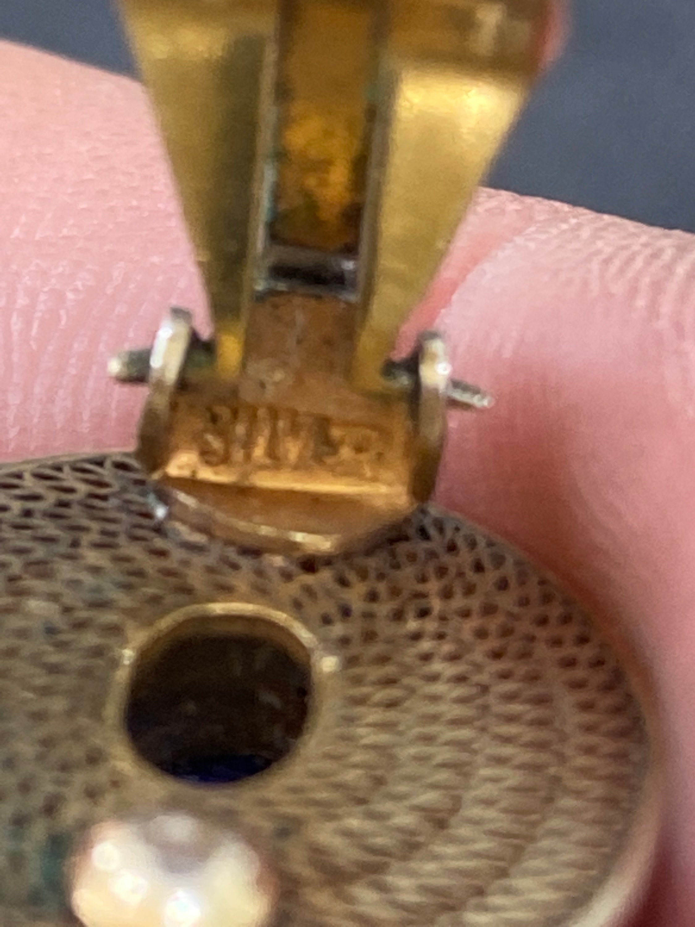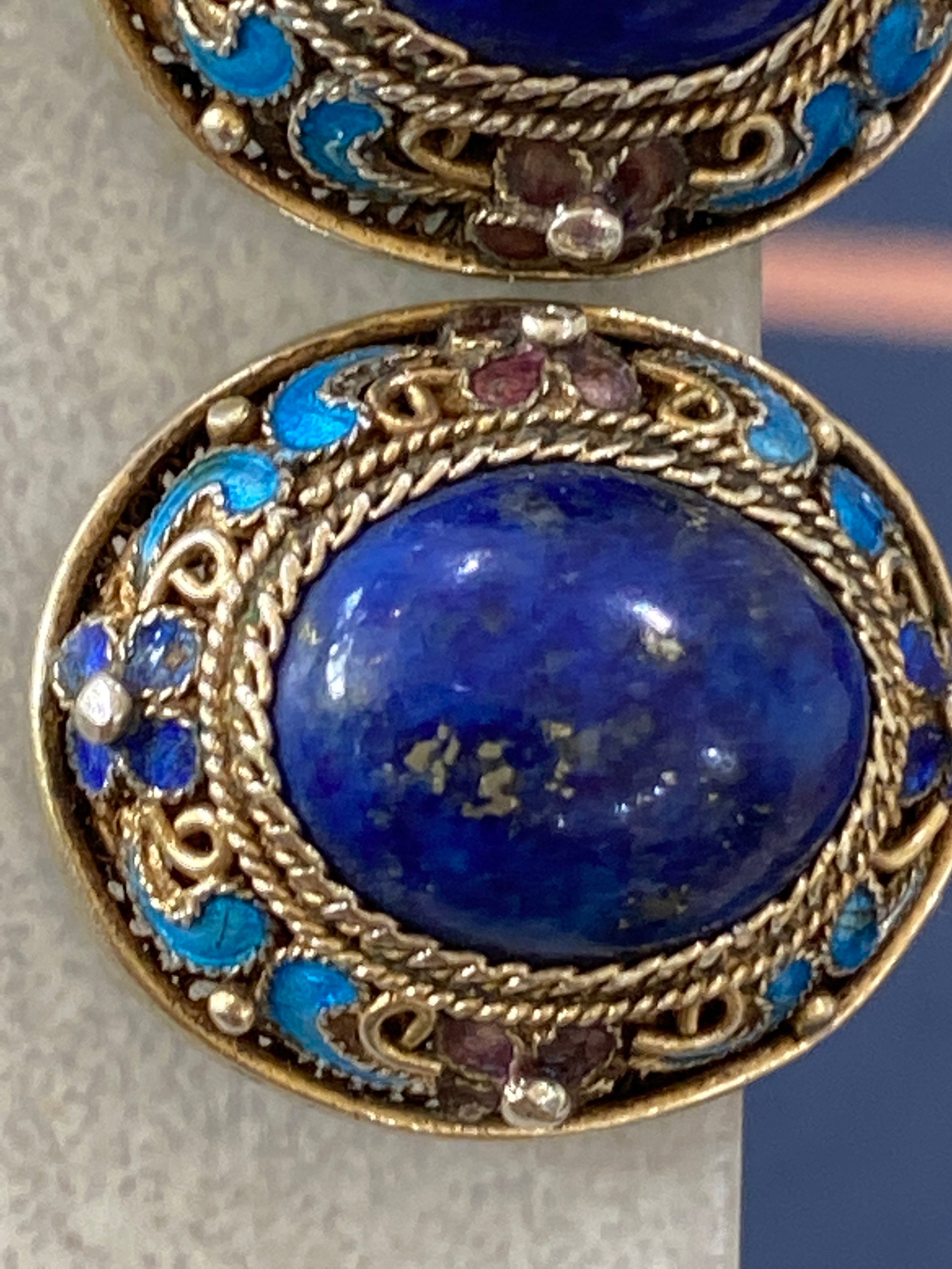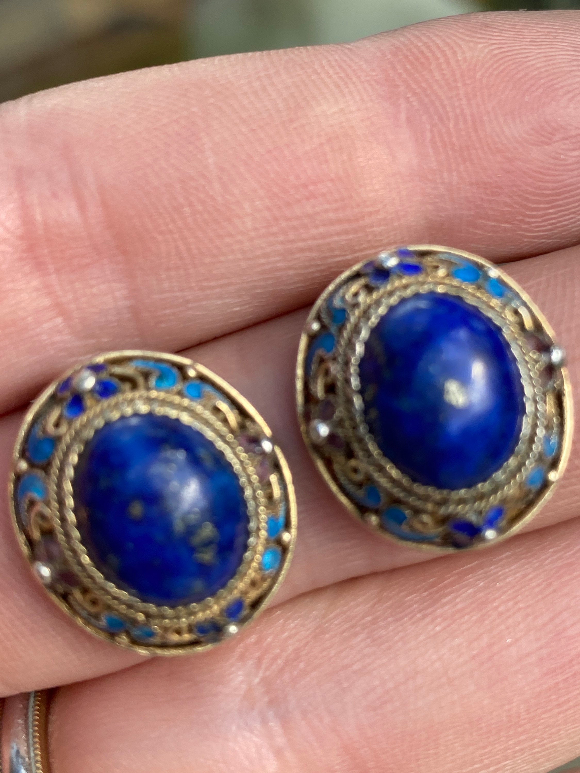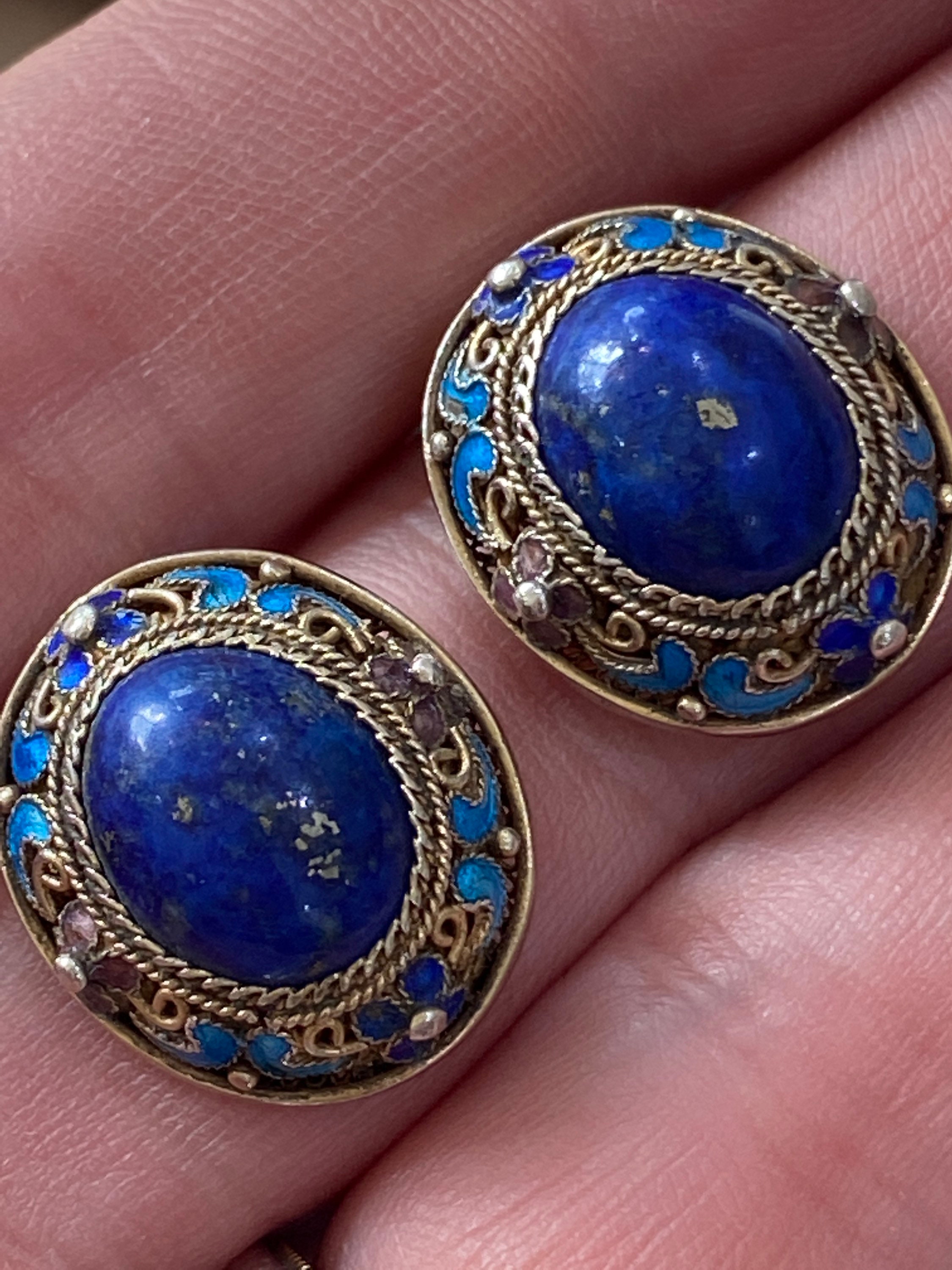 Here is a beautiful gilt silver filigree and enamel earrings .These were probably made for export around the 193-40s. they measure just over 1.5cm in width and 2cm in height. These remainbin excellent condition with no damage.