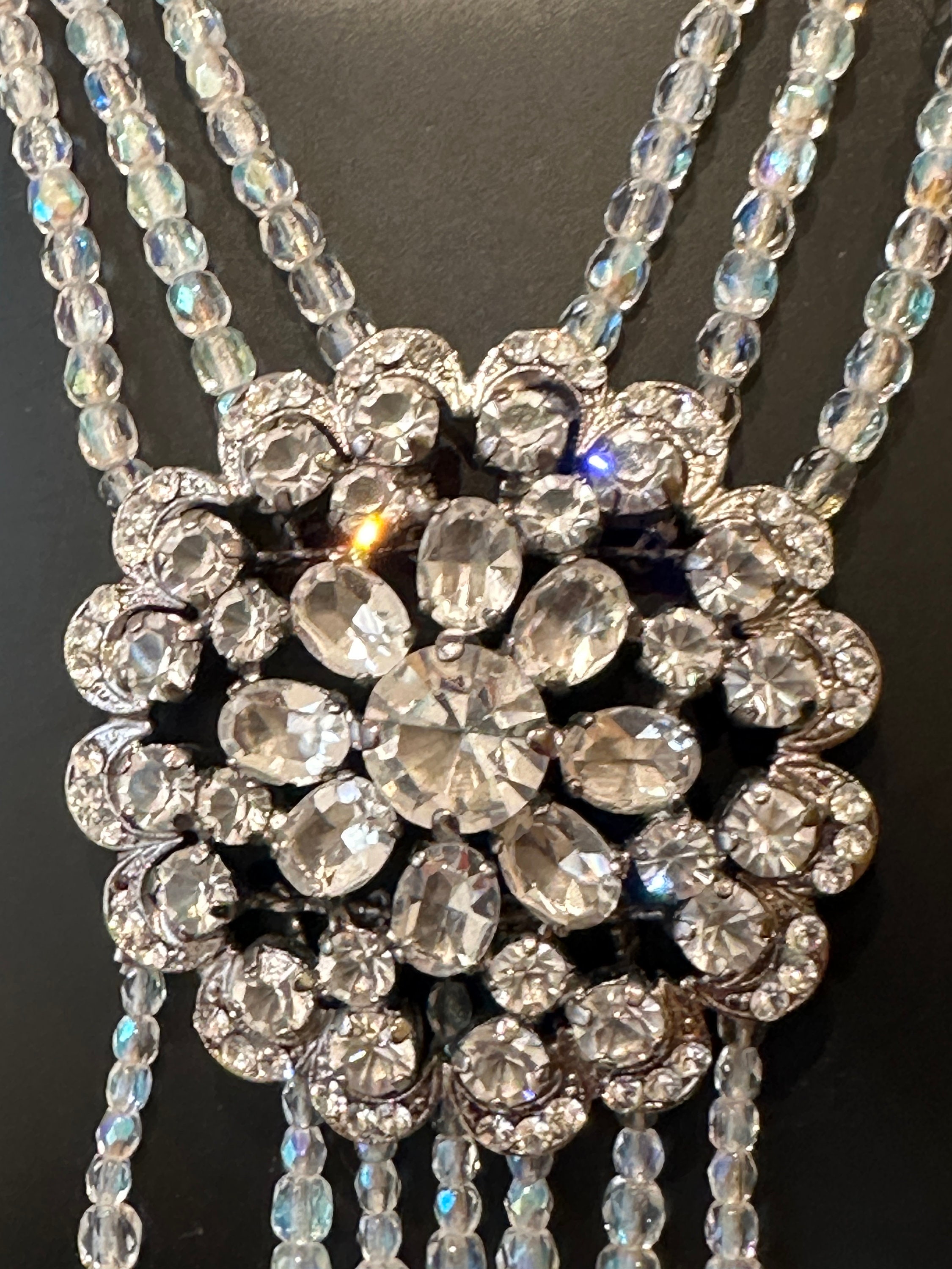 Here is a fantastic necklace by Italian designer Sharra Pagano. It features 3 strands of aura borealis crystals finished with a circular rhinestone pendant with 7 crystals tassels.
